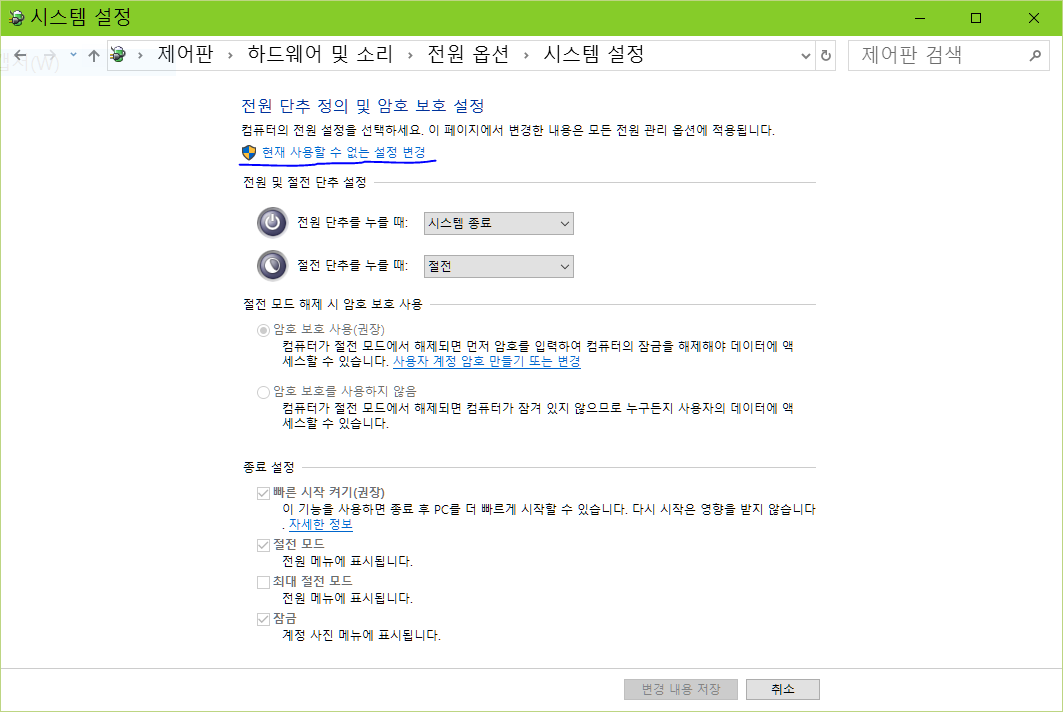 현재 사용할 수 없는 설정 변경을 클릭 합니다.