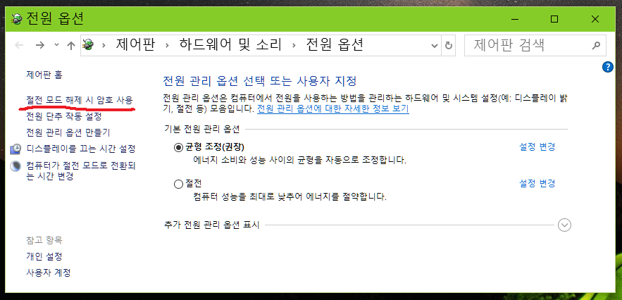 전원 관리 옵션에서 절전 모드 해제 시 암호 사용을 클릭합니다.
