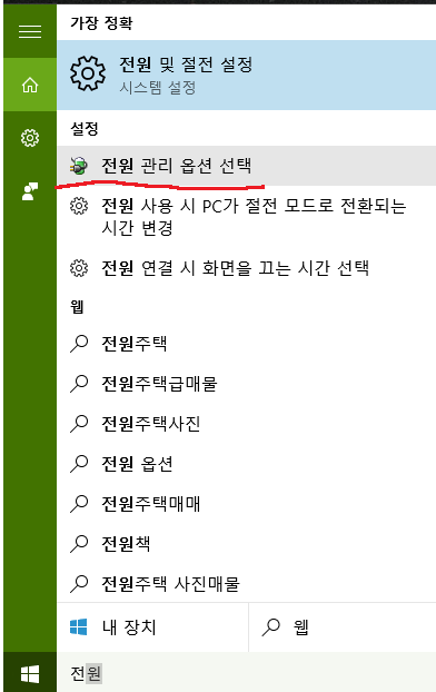 시작의 검색란에 전원을 입력하면 아래 그림처럼 나옵니다.